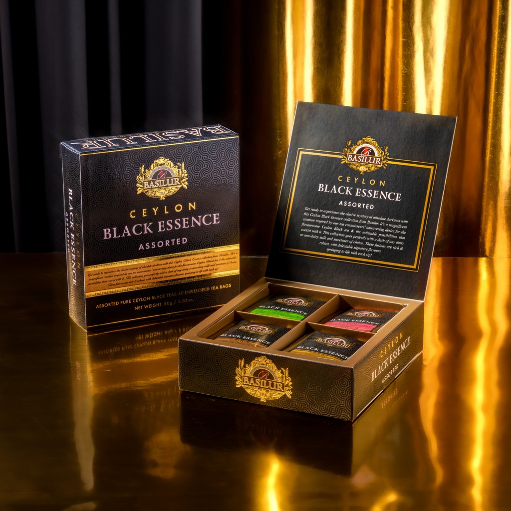Eksklusivt gavesett med 4 smaker av svart Ceylon-te fra den anerkjente Basilur-kolleksjonen Black Essence.