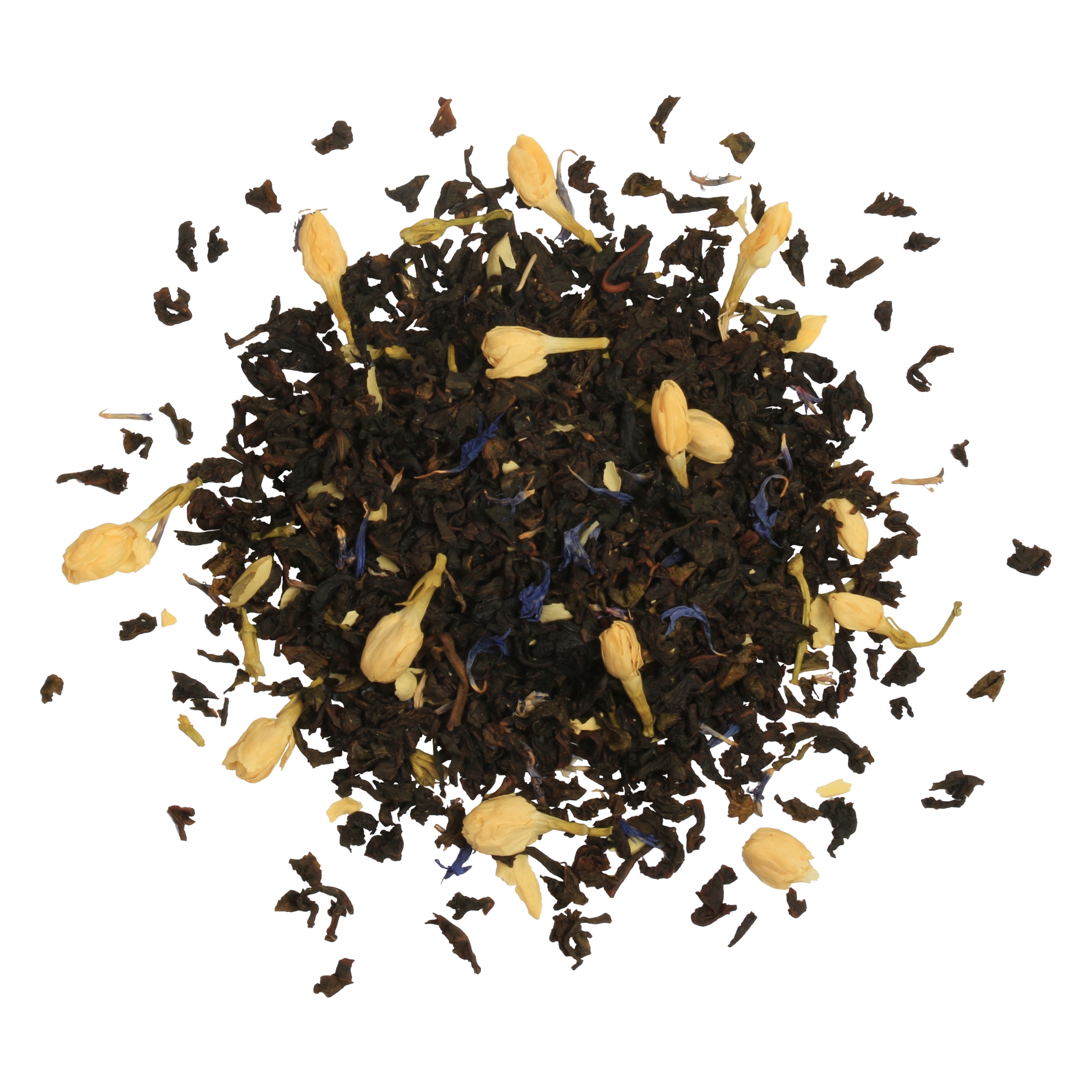 Pekoe svart te 89,7%, jasminblomst 6%, kornblomst 1,5%, naturlig aroma av jasmin.