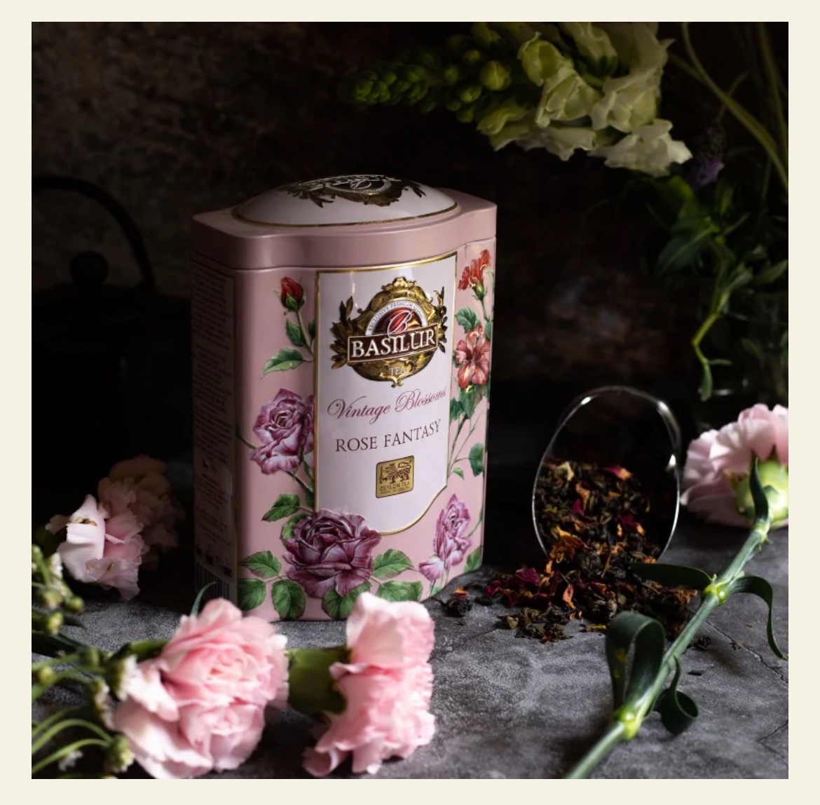 La deg forføre av duften av blomster og romantikk med Basilur Vintage Blossoms Rose Fantasy – en fortryllende blanding av grønn Young Hyson-te, roseblader og hibiskus.