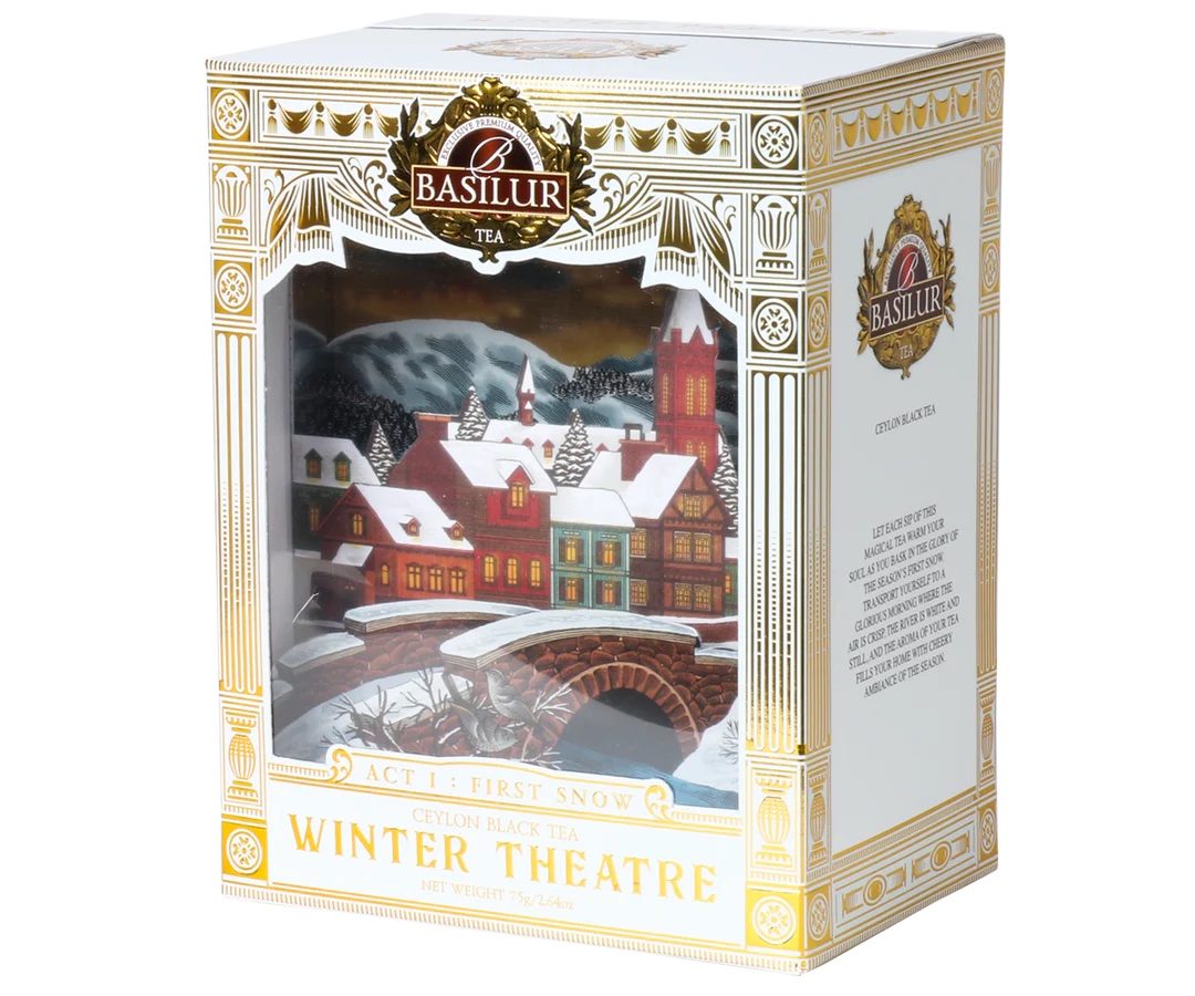 Basilur Winter Theatre – Act I: First Snow åpner serien med en delikat og raffinert smaksopplevelse der design og innhold spiller sammen. Den detaljerte boksen gjør produktet ideelt som gave eller som et dekorativt element i hjemmet. En sort te som kan nytes gjennom hele dagen.